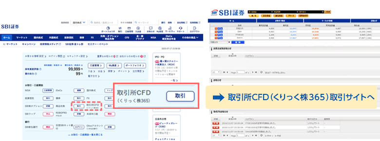 ログイン後の当社WEBサイト右側の「取引所CFD(くりっく株365)取引」ボタンをクリックすると、取引所CFD(くりっく株365)取引サイトが立ち上がります。