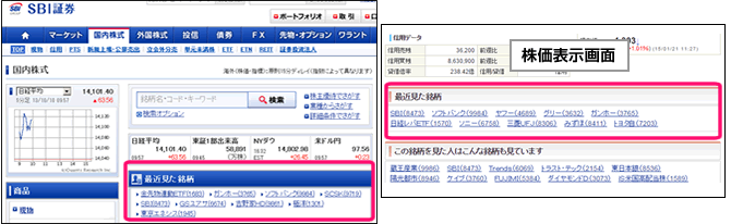 国内株式ページ及び各個別銘柄画面の「株価」ページ下方に、「最近見た銘柄」を10銘柄表示します。
