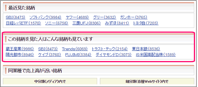 お客様サイトへログイン後の個別銘柄株価画面では「最近見た銘柄」や「この銘柄を見た人が他に見ている銘柄」、「同業種で売上高が近い銘柄」がご覧いただけます。 どなたでも無料でご利用いただけますので、是非ご活用ください。