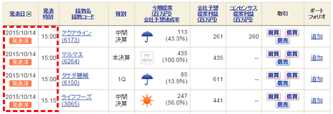 また、決算発表スケジュール画面や個別銘柄業績画面では、現在の経常利益の達成状況を直感的にイメージできるよう3種類のお天気マークで表現!