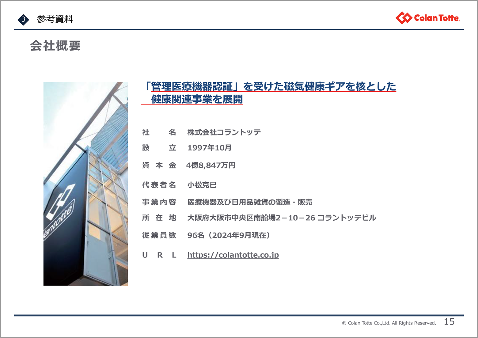 磁気式医療機器の卸・小売業。越境ECも。契約スポーツ選手多数。緊急時連絡サービスを強化中