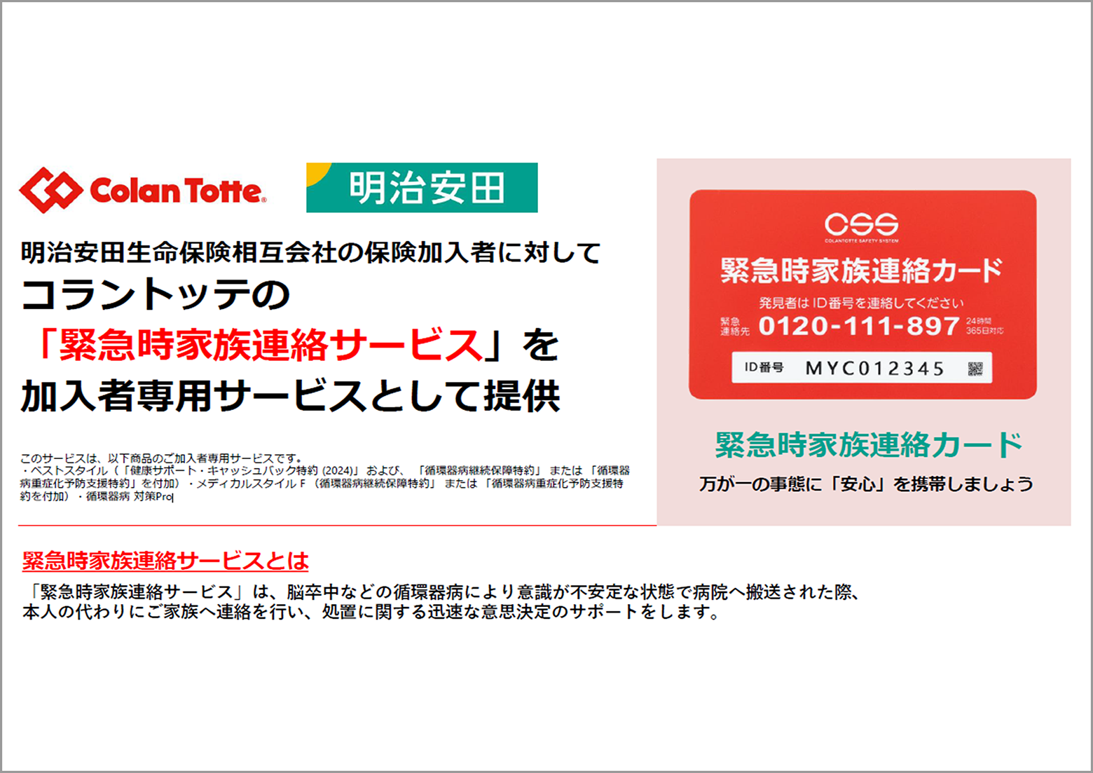 - 上記5スライド目の「緊急時家族連絡サービス」についての資料は株式会社コラントッテが作成したものです