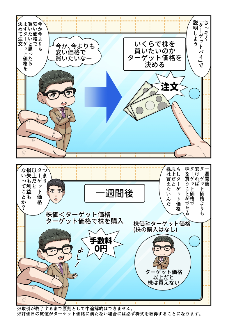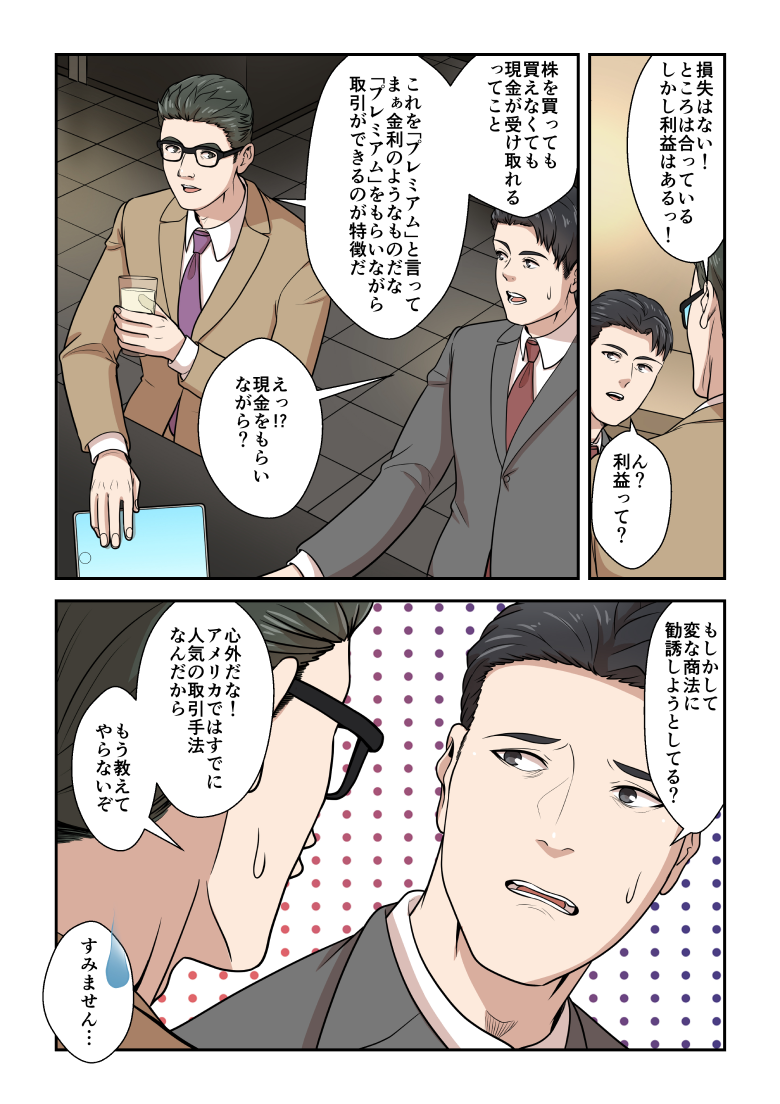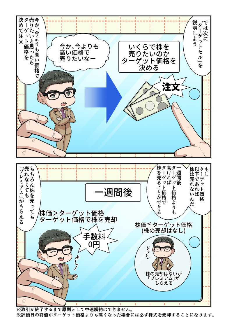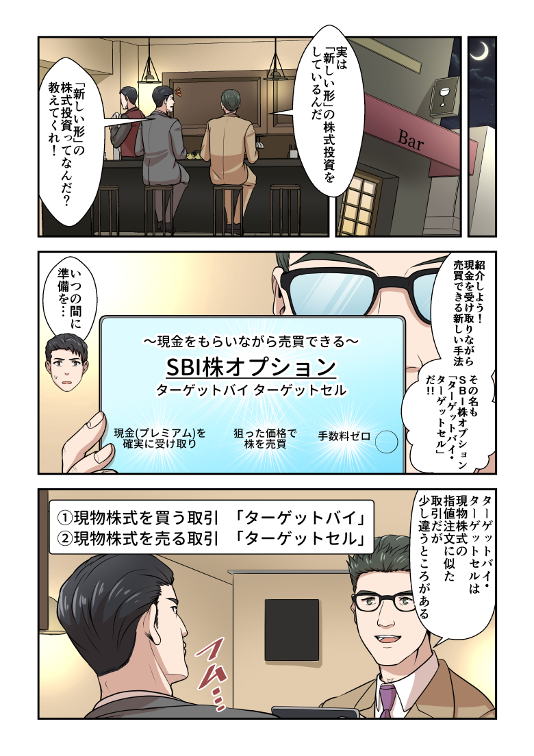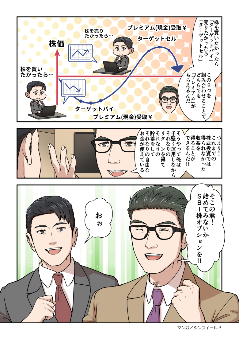 高山の熱心な説明に感銘を受けた主人公は、「SBI証券」の株オプション「ターゲットバイ・ターゲットセル」に興味津々。これまでの株式投資では得られなかった魅力的な収益に魅かれ、是非始めてみたいと思いました。