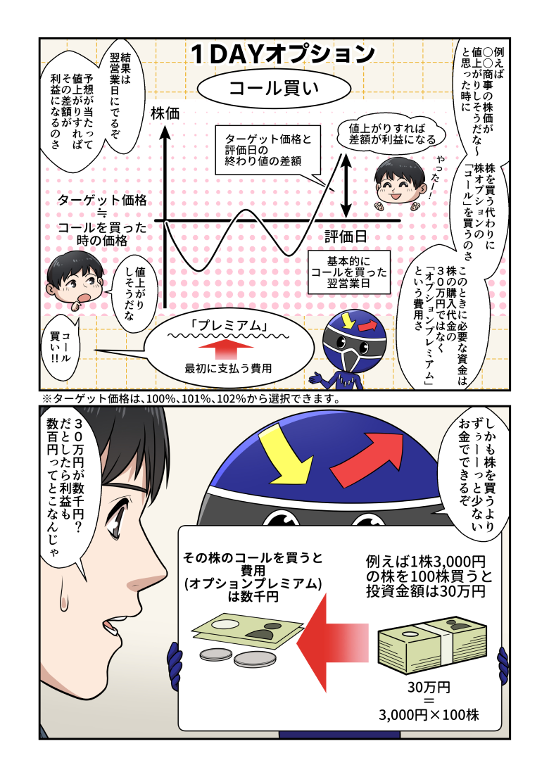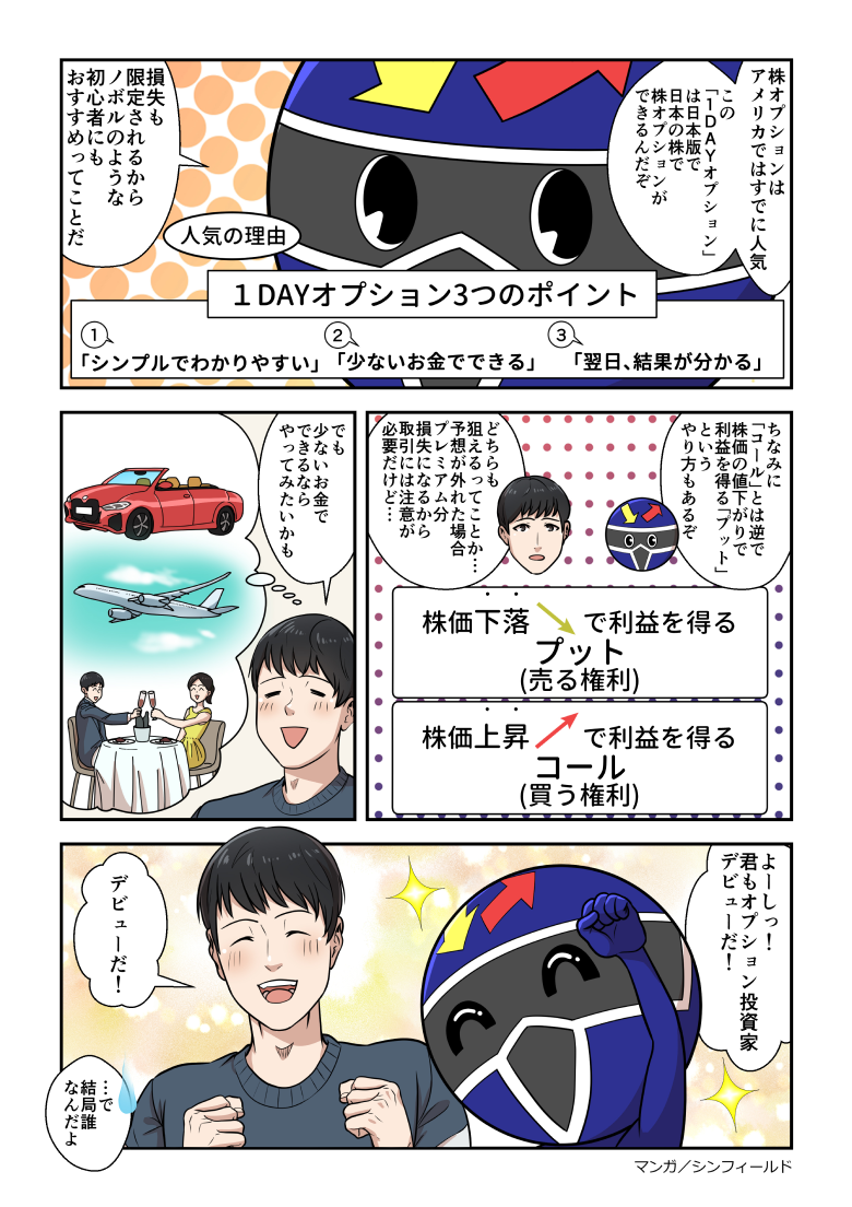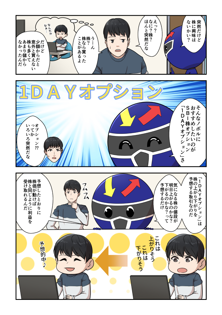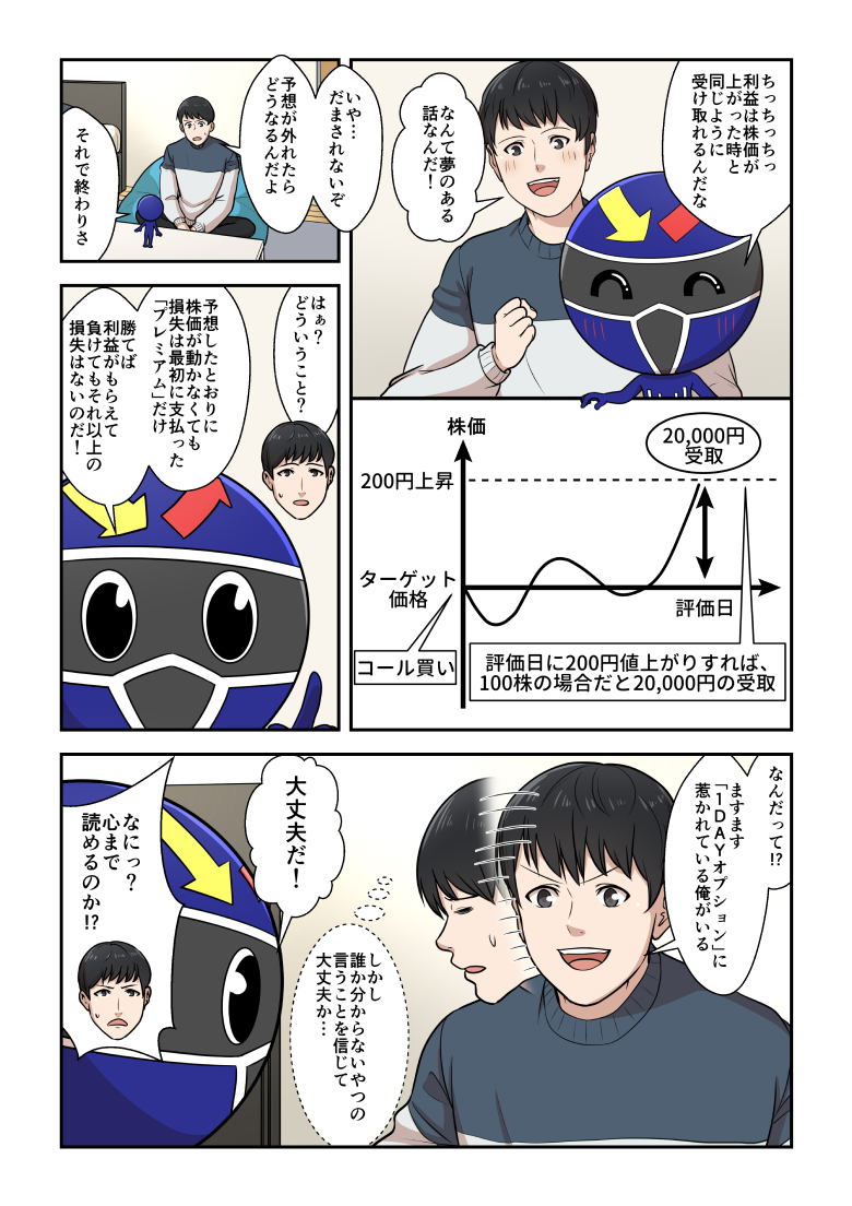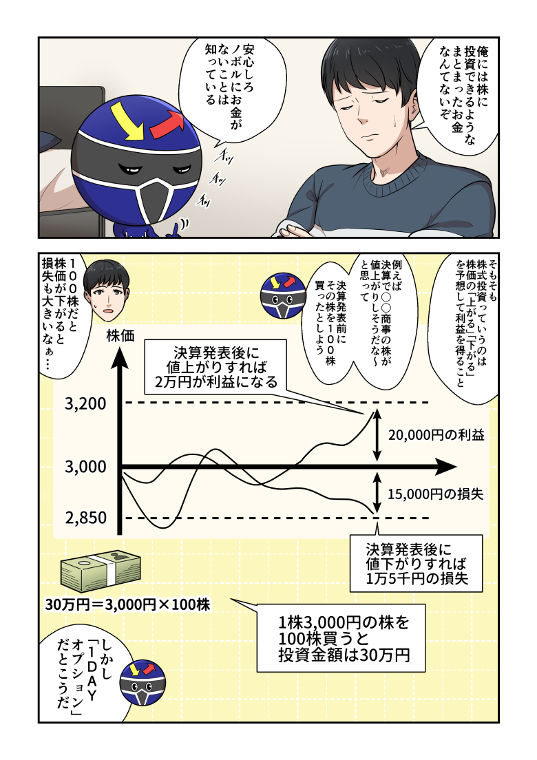 少ないお金で株式投資ができる「1DAYオプション」に興味津々のノボル。株価の予想で利益を得るチャンス!初心者でも損失が限定されるので安心。
