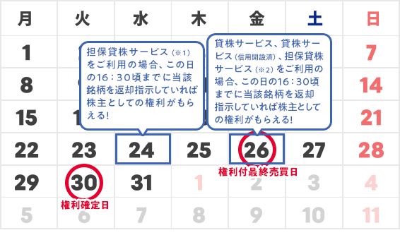 - 銘柄によって権利付最終売買日は異なります。11/20(木)が権利確定日の場合、権利付最終売買日は11/18(火)となります。