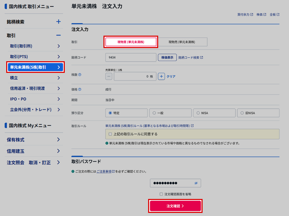「単元未満株 (S株) 取引」をクリックし、単元未満株注文に切り替える