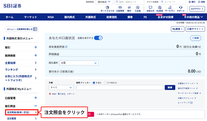 外国株式トップ>外国株式Myメニュー>取引照会>注文照会(取消・訂正)をクリック。注文照会画面に切り替わります。
