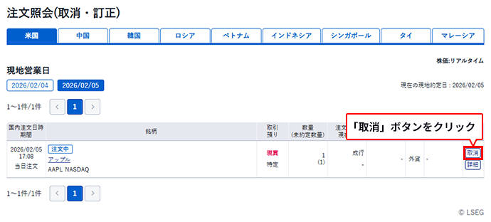 対象となる注文の「取消」または「訂正」ボタンをクリック。ここでは「取消」を実行します。
