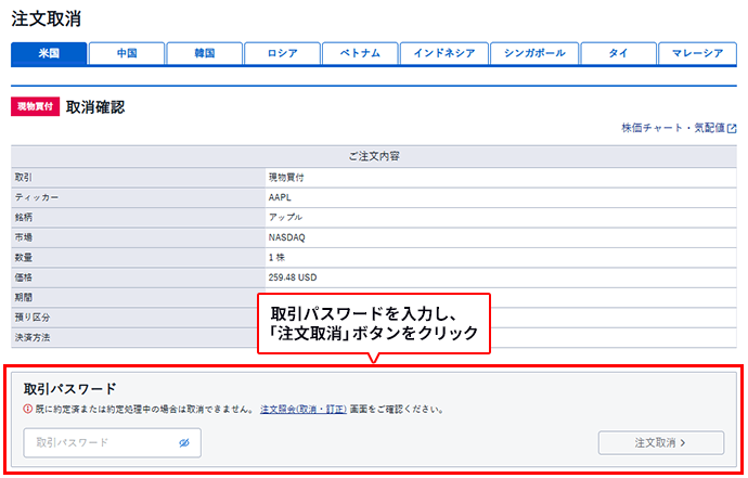 内容を確認の上、取引パスワードを入力し、「注文取消」ボタンをクリック。