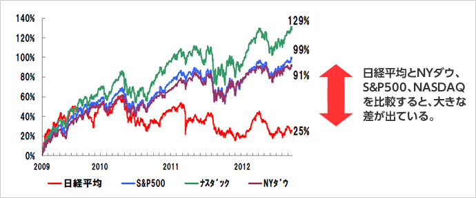 ここでは、個別株ではなく、両国の代表的な株価指数である日経平均とNYダウ、S&P500、NASDAQを比較しました。