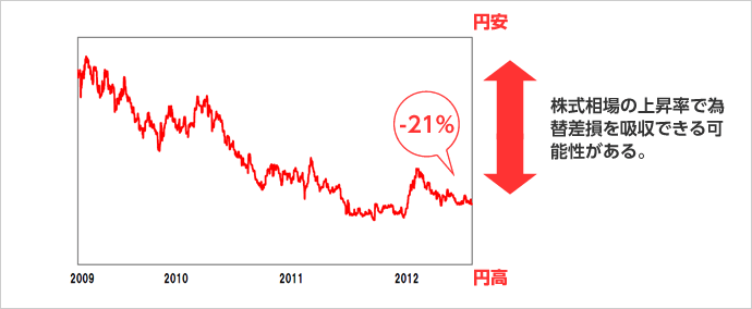 また、株式相場と為替相場のボラティリティーを考えると、仮に円高方向へ相場が動いたとしても、株式相場の上昇率で為替差損を吸収できる可能性もあります。