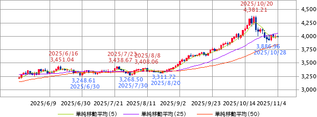 ニューヨーク金は米中の通商合意見通しや米連邦公開市場委員会(FOMC)後のドル高を受けて売り優勢となったが、通商合意が伝えられると下げ一服となった。中心限月となる12月限は10月3日以来の安値3,901.3ドルを付けたのち、下げ一服となった。米中の通商合意を受けて弱材料が一巡し、買い戻しなどが入った。米FOMCで利下げが決定されたが、パウエル米連邦準備理事会(FRB)議長は12月利下げは既定路線ではないと述べた。一方、米政府機関閉鎖について、4日の選挙後に協議がやや容易になるとみられている。