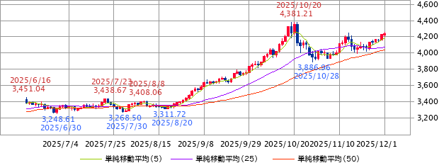 ニューヨーク金は米連邦準備理事会(FRB)の利下げ期待を受けて買い優勢となった。中心限月となる2月限は11月13日以来の高値4,263.1ドルを付けた。ウォラーFRB理事やミランFRB理事が利下げを支持した。CMEのフェドウォッチで、9~10日の米連邦公開市場委員会(FOMC)の利下げ確率は87.4%(前週71.0%)に上昇した。今後発表される経済指標を確認したい。11月13日の高値4,285.6ドルが目先の抵抗線である。