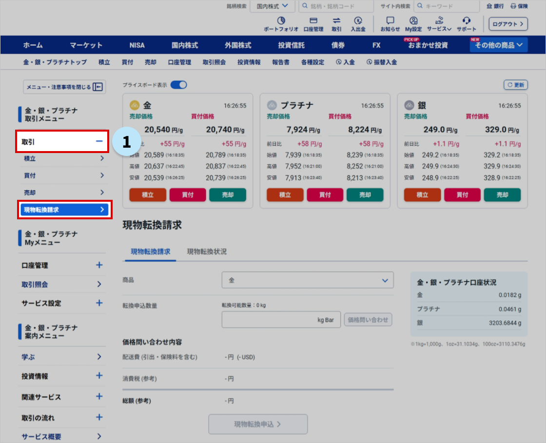 1. 金・銀・プラチナ取引メニュー>取引>現物転換請求より申込ができます。