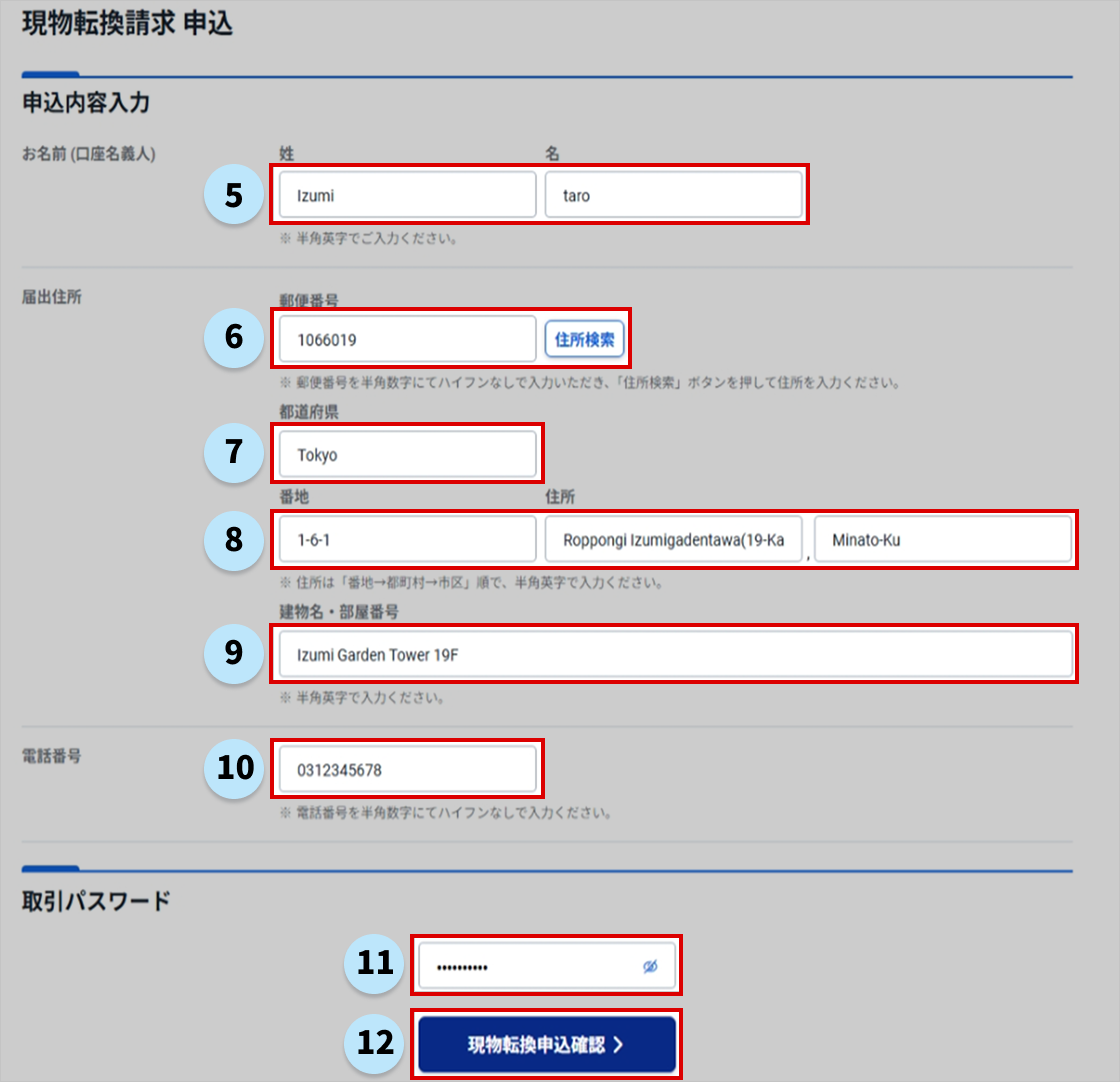 4. 現物転換にかかる概算費用にご同意いただき、配送先住所入力画面へ進みます。