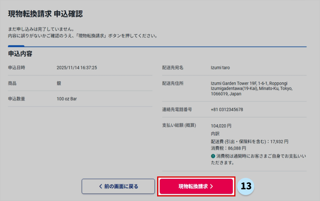 13. お申込内容をご確認いただき、お間違えがなければ、現物転換請求申込を確定させます。