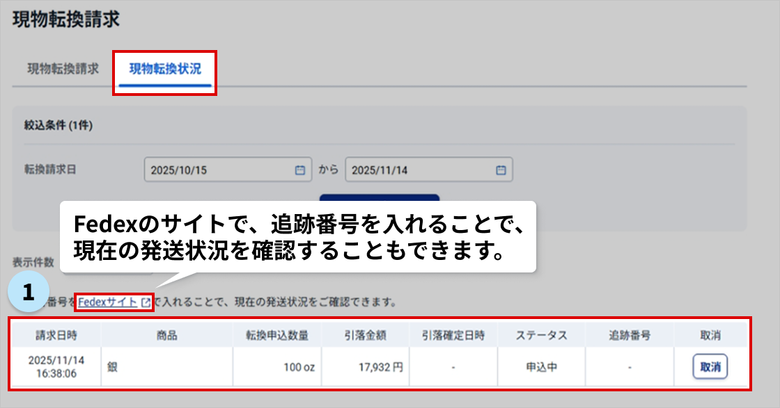 現物転換請求>現物転換状況の確認方法