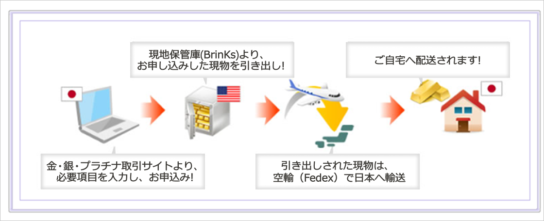 毎週月曜日に締切したお申し込みは、現地保管先(Brinks)からお客さまのご自宅まで、原則その週内に配送いたします。 |