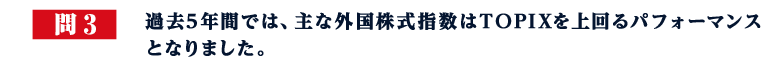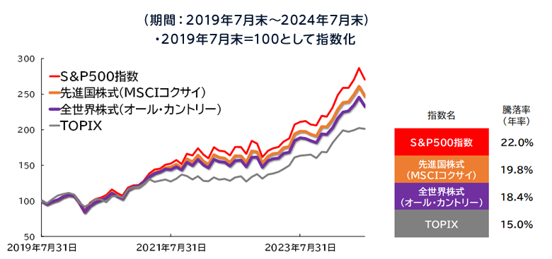 主な株式指数の過去5年間の騰落率をみると、外国株式指数はTOPIXを上回るパフォーマンスとなりました。