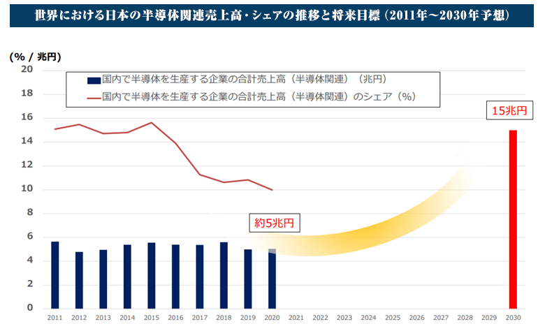 日本政府は、国内企業の半導体関連売上高を2020年の約5兆円から、2030年には15兆円超とする目標を掲げています。