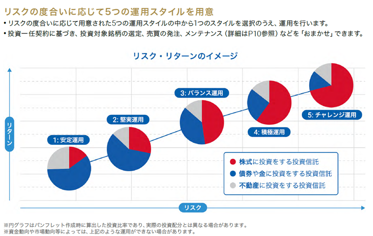 お客さまには運用にかかる費用として、運用資産額(現金部分を除く)に対して1.21%(税込・年率)の手数料をご負担いただきます。 その他に、投資対象ファンド毎に設定される、信託報酬、その他の費用を間接的にご負担いただきます。(信託財産留保額はかかりません。) 信託報酬(X)は、全ての投資対象ファンドにおいて一律に、信託財産に対して0.1606%(税込・年率)かかります。但し、投資対象ファンドを通じて投資するETFの経費率(Y)を足し合わせた"実質的な信託報酬(X+Y)"は、投資対象ファンド毎に異なります。なお、当該ETF の経費率(Y)は、0.030%〜0.480%(年率)の範囲内に収まります。その他の費用として、信託財産にかかる監査報酬、信託事務の処理に要する諸費用、法定書類(目論見書、運用報告書等)の作成等にかかる費用、組入有価証券の売買の際に発生する売買委託手数料、外貨建資産の保管に要する費用等の費用 は、原則としてお客さまの負担とし、信託財産の中から支払われます。なお、これらの費用は、運用状況等によって変動するため、事前に具体的な金額や上限額等を示すことはできません。 ご負担いただく利用料等およびリスク情報につきましては、契約締結前交付書面、投資対象ファンドの交付目論見書等をご確認ください。