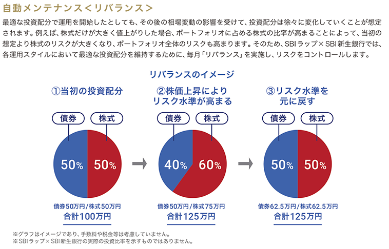 「SBIラップ× 」は、お客さまと株式会社FOLIOとの間で投資一任契約を締結するサービスです。「SBIラップ× 」は預金ではなく投資一任契約に基づくサービスのため、元本保証および利回り保証のいずれもなく、また、預金保険制度の対象ではありません。本サービスの利用開始にあたり、SBI証券総合口座開設が必要です。当社にインターネット取引口座をお持ちの個人のお客さまにお申し込みいただけます。 法人口座のお客さまは、現在お申し込みいただけません。本サービスは投資一任契約に基づくものであるため、原則としてお客さまが自ら投資信託の個別の売買注文を行うことはできません。ご契約の締結にあたっては、契約締結前交付書面、投資対象ファンドの交付目論見書等をよくご確認いただき、ご負担いただく利用料等およびリスク情報等について十分にご理解いただき、ご自身でご判断ください。