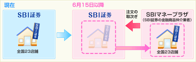 これに伴い、開店以来お引立ていただいておりました、SBI証券の支店(全国23店舗)につきましても、平成24年6月15日より、SBIマネープラザ株式会社が運営する「SBIマネープラザ」店舗としてご利用いただくこととなります。