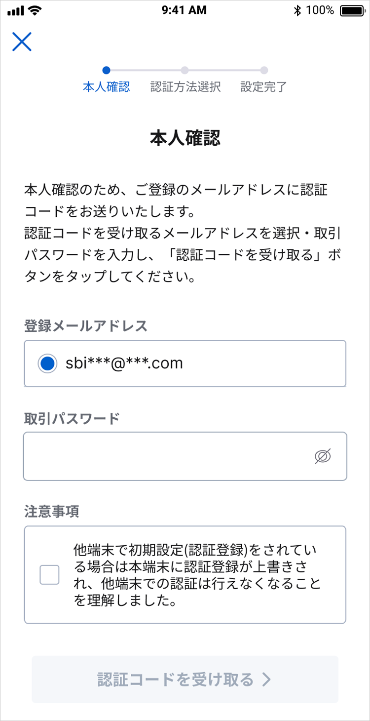 登録メールアドレスと取引パスワードを入力し、注意事項にチェックを入れたうえで「認証コードを受け取る」をタップしてください。