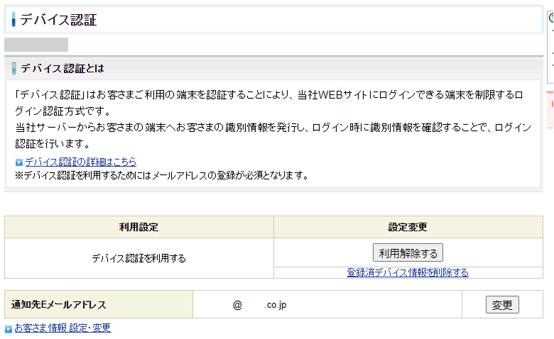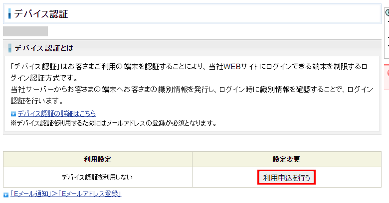 (デバイス認証を利用している場合は下図赤枠部分が「利用解除する」ボタン、利用していない場合は「利用申込を行う」ボタンが表示されております)