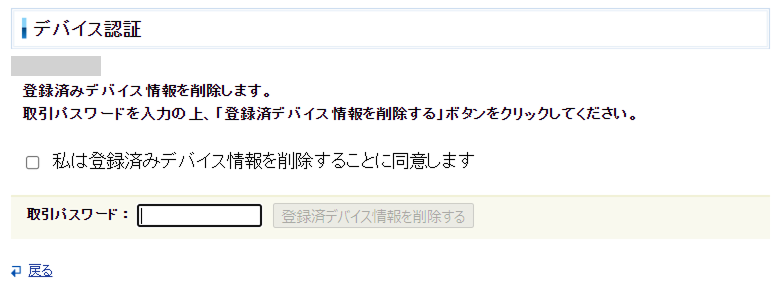 チェックボックスにチェックを入れ、取引パスワードを入力後、「登録済デバイス情報を削除する」ボタンをクリックしてください。