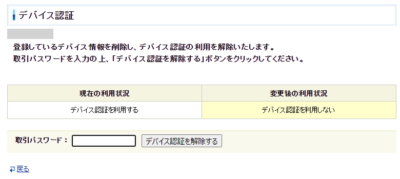 取引パスワードを入力し、「デバイス認証を解除する」ボタンをクリックしてください。