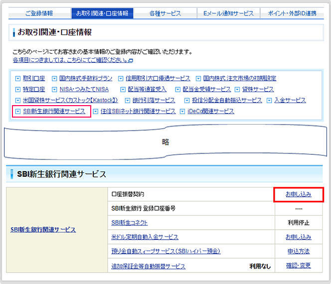 当社WEBサイト内、「My設定」>「お客さま情報 設定・変更」>「お取引関連・口座情報」>「SBI新生銀行関連サービス」内の口座振替契約にてお申し込みをクリック>「口座振替の契約へ進む」をクリック>規約 (個人情報の取り扱いについて) のご確認>SBI新生銀行 口座振替サービスページ>申込の完了。