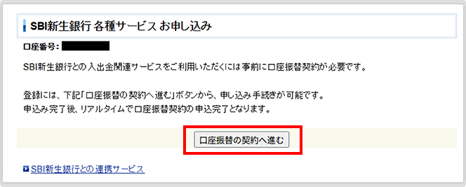 以後、画面の指示に従い、お手続きください。SBI新生銀行の口座振替サービスページに遷移いたします。