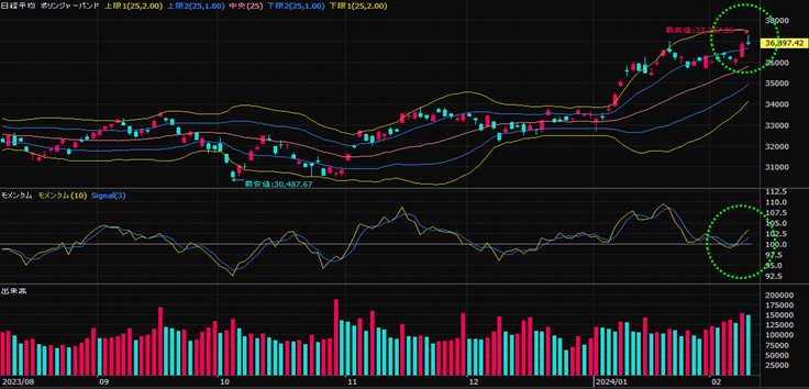 ただ、+2σを見ると下向きに変化しており、上値の抵抗になることが予想される。そのため今週は、+1σ上を維持するとともに、+2σが上向きに変化するかが注目ポイントだ。仮に+1σ上を維持するとともに+2σが上向きに変化するようだと、上昇トレンドの発生が期待されるとともに、37,000円台を回復して維持することが視野に入るため、売りポジションを持っている投資家は買い戻すタイミングを逃さないようにする必要があろう。