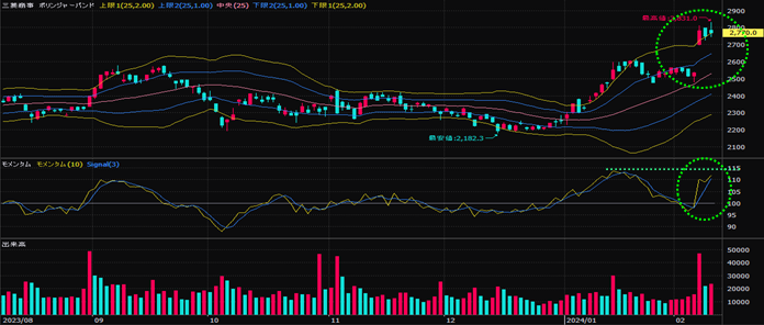 上向きの+2σに沿って維持できるかやモメンタムの上昇が続くか注目 トレンドと売買タイミングを教えてくれるボリンジャーバンドを見ると、業績発表の翌営業日の7日に窓をあけて大幅高となり、+2σを上回って終えるとともに+2σが上向きに変化した。その後は上向きの+2σに沿って推移しているのが分かる。そのため今週は、+2σ上を維持できるかが注目ポイントだ。仮に+2σ上を維持するようだと、株式分割後の上場来高値更新の継続が視野に入る反面、+2σ上を維持できずに割り込んだり、割り込んだまま推移したりするようだと、上向きの+1σに接近したり、下回ったりすることが考えられ、高値掴みにならないよう注意する必要がありそうだ。そうしたなか、上昇と下落の勢いを教えてくれるモメンタムを見ると、モメンタムとその移動平均線であるシグナルの両方が、上昇と下落の勢いの判断の分かれ目となる100ライン上で上昇を続けているのが分かる。そのため今週は、2本線の上昇が続くかが注目ポイントだ。仮に2本線の上昇が続き、過去の高い水準を上回るようだと、高値更新の継続が期待される反面、2本線が上昇しても限定的だったり、下向きに変化して低下したりするようだと、+2σ上を維持できずに割り込んだり、+1σ辺りまで下落することが考えられ保有者は要注意だ。 |