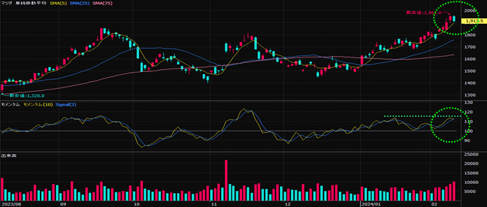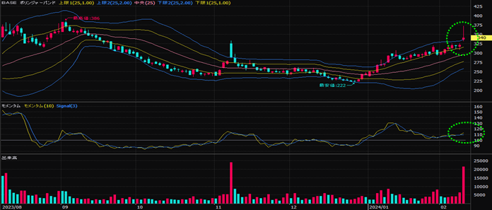 ※2024/2/9時点で、チャート形状銘柄分析機能を使用し、期間は1ヵ月、チャート形状が「まだ上昇?」の出来高が多い5銘柄分析