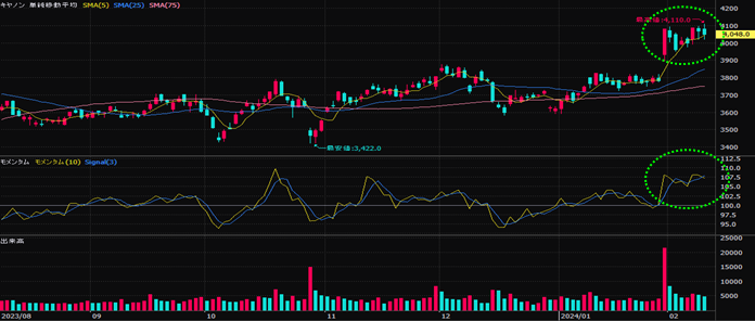 5日移動平均線上を維持できるかやモメンタムの上昇がカギ 日足チャートを見ると、上向きの5日移動平均線に沿って上昇が続いていたものの、先週末は反落して5日移動平均線をわずかに下回って終えているのが分かる。そのため今週は、5日移動平均線上を回復して維持できるかが注目ポイントだ。仮に5日移動平均線上を維持するようだと、昨年10月12日の高値を再び上回るとともに上昇トレンドが継続して同年9月20日の高値に接近することが視野に入る反面、5日移動平均線上を回復できずに推移するようだと、5日移動平均線が下向きに変化して上値の抵抗になり、25日移動平均線辺りまで下落することが考えられるため、保有者は注意する必要があろう。そうしたなか、上昇と下落の勢いを教えてくれるモメンタムを見ると、モメンタムとその移動平均線であるシグナルの両方が、上昇と下落の勢いの判断の分かれ目となる100ラインを上回っているものの、モメンタムが下向きに変化してシグナルを下回っているのが分かる。そのため今週は、モメンタムの低下が続くかが注目ポイントだ。仮にモメンタムとシグナルの低下が続くようだと、5日移動平均線を下回ったままで推移したり、25日移動平均線辺りまでの下落が視野に入ったりする反面、上向きに変化するようだと、5日移動平均線上を回復することが期待される。 |