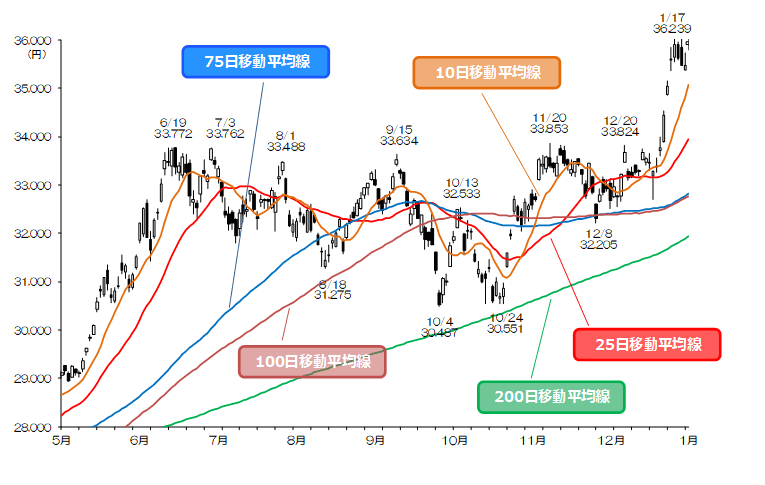 上値メドは、1990年1/19につけた安値36,365円、心理的節目の36,500円、37,000円などが考えられる。下値メドは、10日移動平均線、1/10高値(34,539円)、25日移動平均線、心理的節目の33,000円などが考えられる。