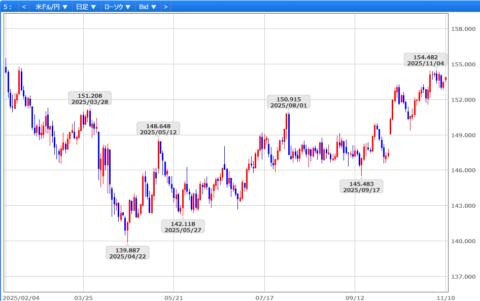 10/30の米中首脳会談を受けた貿易摩擦懸念が後退を好感し、10/30-31にかけて154円台を維持した流れを継いだ11/3も底堅く、153円99銭から154円30銭へ上昇。また、米10月ISM製造業指数の下振れにも153円台後半までの反落に留まるなど、押し目買い意欲を確認。さらに、11/4には154円48銭へ上昇したものの、片山財務相の円安牽制発言や日経平均株価の反落が重荷となり、153円32銭へ調整。また、11/5には、日経平均が一時2,400円超安と急落したリスク回避を背景に152円96銭へ下落。ただ、その後の米10月ADP全米雇用報告やISM非製造業景気指数の上振れを受け、154円36銭へ反発。一方、11/6の10月企業人員削減数が大幅増とともに、12月FOMCの追加利下げ観測が強まり152円83銭へ、さらに11/7の東京市場では152円82銭へ下落。ここでも、152円台後半での押し目買い意欲に支えられ、153円台前半を中心に小幅な動きを継続。NY市場終盤には、政府機関閉鎖の解除に向け民主党が予算要求の一部緩和に応じるとの報道に153円59銭へ上昇し、153円42銭で取引を終えました。