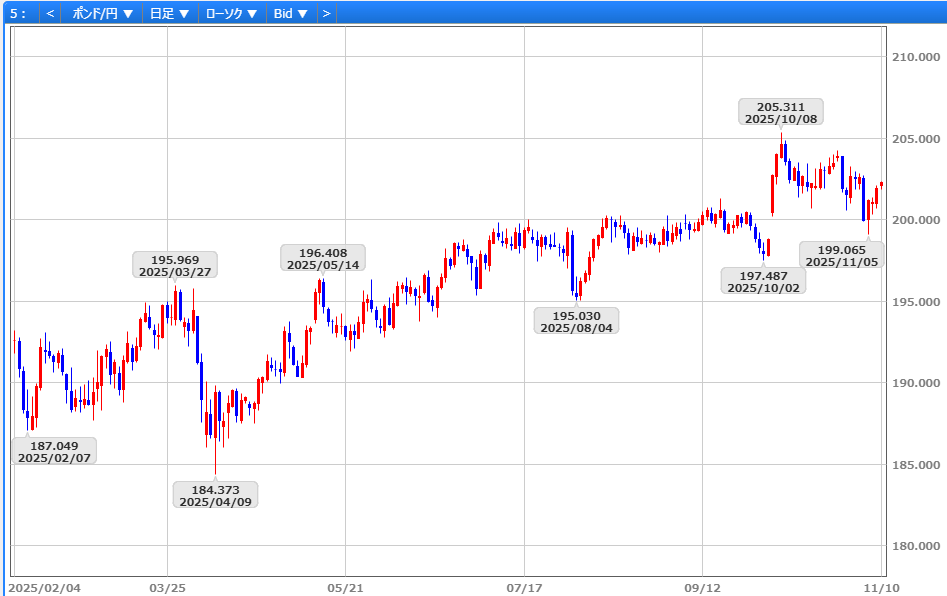 米FRBが10/29のFOMCで「タカ派寄りの利下げ」を決定したことを受け、ドル堅調地合いが続く中、ポンドドルは10/31に4/14以来の1.3097ドルへ下落。その反動もあり、11/3には1.3162ドルへ反発しましたが、11/4にリーブス財務相が11/26に公表予定の秋季予算案をめぐり、大規模な増税の可能性を示唆。こうした財政見通しの不透明感や金利先安観を強め、11/4と11/5に1.3010ドルへ一段安となりました。ただ、短期の下落行き過ぎを調整する動きで下げ止まり、11/6の米企業人員削減数が大幅に悪化したこと、英中銀政策委員会で「ハト派寄りの現状維持」を決め、「リスクは従前からバランス」としたことから11/7には1.3175ドルへ反発し、1.3160ドルで取引を終えました。一方、ポンド円は11/3の202円81銭を高値に、11/5にかけてポンドドルの下落やドル円の153円割れへの調整に伴い199円07銭へ下落。しかし、11/6-7にかけてポンドドルの反発やドル円の152円台後半での底堅さを確認したことから202円09銭へ持ち直し、201円88銭で取引を終えました。