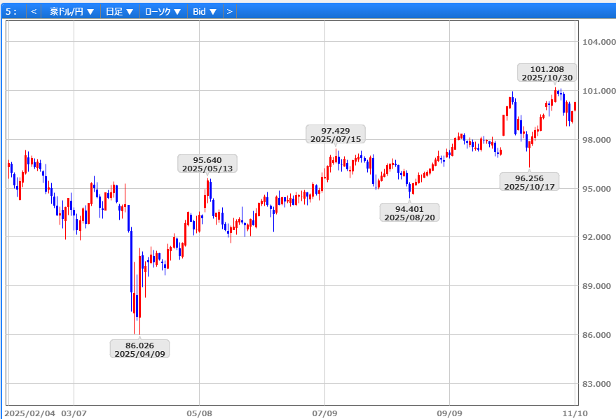 11/3の101円14銭を高値に、翌11/4の豪中銀政策理事会を控え、10/30の高値(102円21銭)を前に上値の重い展開となりました。理事会では予想通り政策金利は据え置かれ、声明文ではインフレ懸念に言及しつつも、見通しについて「上下双方向の不確実性が高まっている」との認識が示され、豪ドル売りに反応しました。さらに片山財務相による円安牽制発言を受けて円買いに反応し、99円47銭へ下落。また、11/5には日経平均株価が一時2,400円超まで急落し、リスク回避を背景に98円83銭へ一段安となりました。ただ、その後発表された米ADP全米雇用報告やISM非製造業景気指数の上振れを好感、100円39銭へ持ち直しました。しかし、11/6発表の米10月企業人員削減数の大幅な悪化となり、NY株式市場の下落が嫌気され、再度98円83銭へ反落。それでも日足・基準線(98円73銭)を下値支持線として、買戻しが入り11/7には99円76銭へ反発し、99円61銭で取引を終えました。