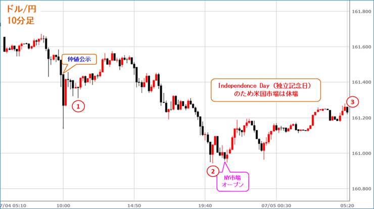 米国市場では、独立記念日で米国の主要市場が休場となり全般的に限定的な動きとなった。その中で、6月の米雇用統計への警戒感からポジション調整の動きも見られ、ドルはやや上値の重い動きとなった。ただ、引き続き円の先安観も根強く、底固い動きとなった。