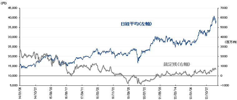 4月19日時点の裁定残高は、ネットベースで1兆8,780億円の買い越し(前週は2兆417億円の買い越し)と減少した。一方、株数ベースでは、7億5,449万株の買い越しで、4月12日時点(7億7,332株の買い越し)から減少している。