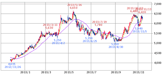 昨年2012年11月26日の安値4,035円から今年5月16日6,650円までアベノミクス相場に乗って、大幅高。その後、反落し9月5日に5,080円の安値をつけています。再度、上昇トレンドになっており、直近は6千円台の高値圏での推移となっています。