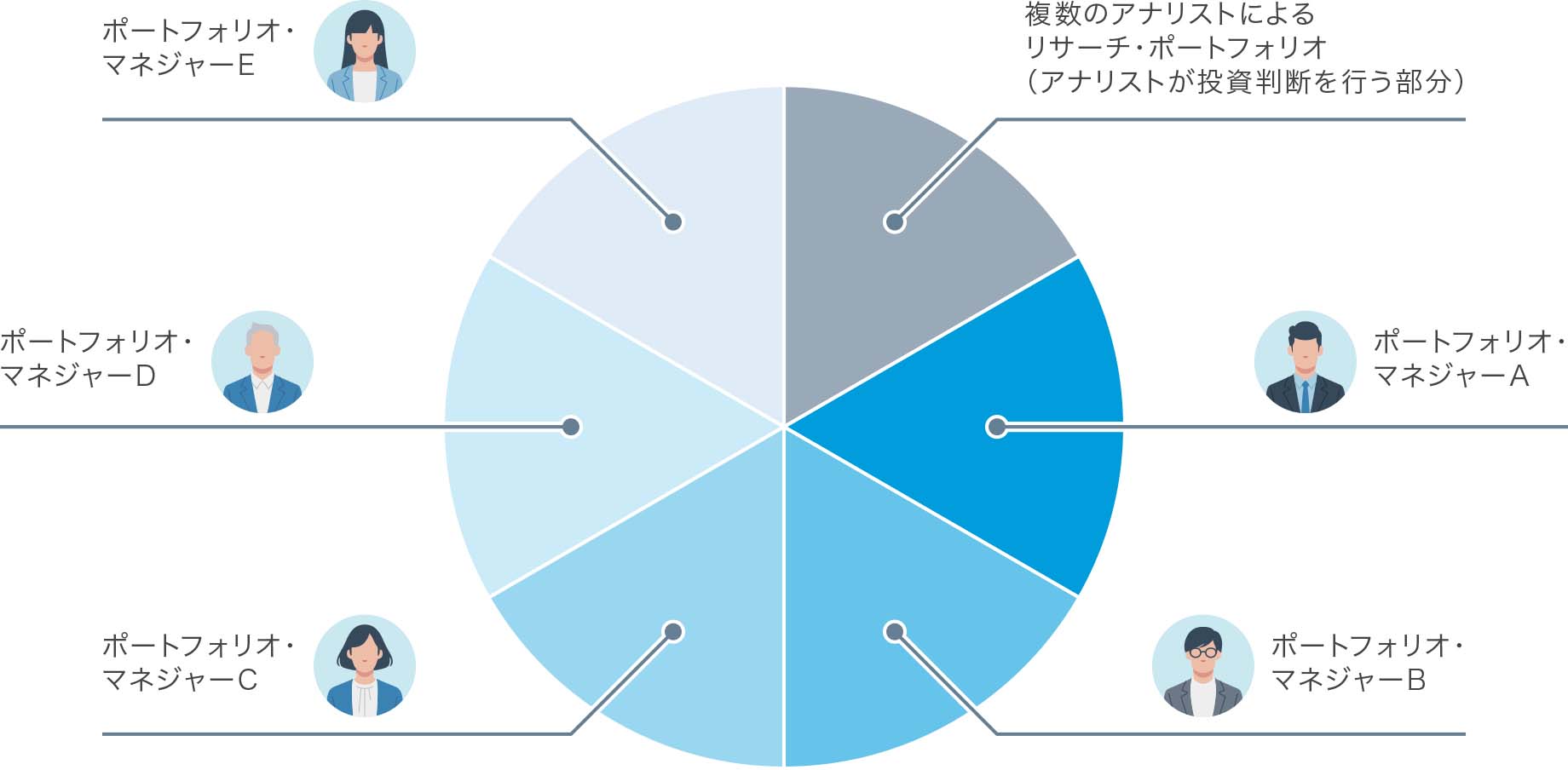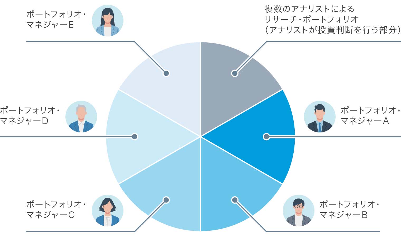 - 複数のポートフォリオ・マネジャーが連携してひとつのファンドを運用することで長期的に優れた運用成果の実現を目指します。