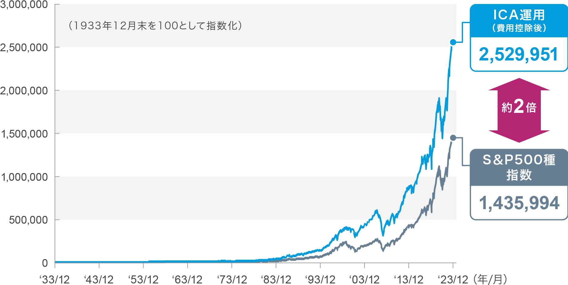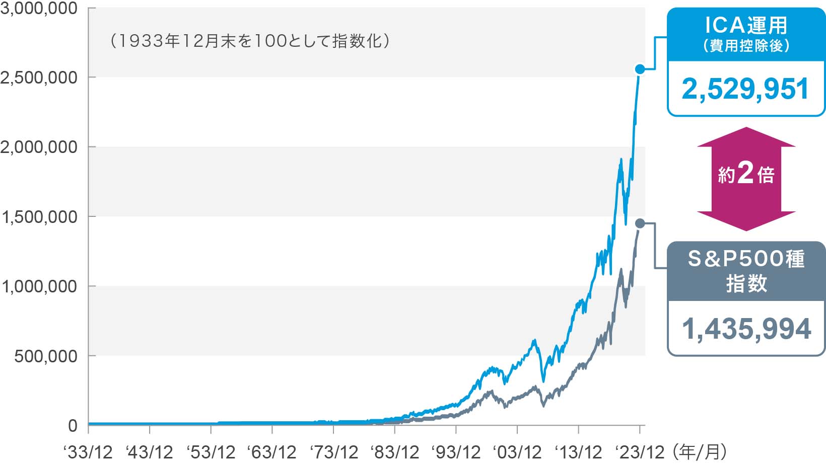 - ※ICA運用はコンポジット(トータルリターン、米ドルベース)を使用。購入時手数料3%および信託報酬等の費用年率1.08%(信託報酬1.03%、その他費用0.05%)相当を控除しています。ただし、購入時手数料および信託報酬の税金等は考慮していません。コンポジットとは、同一の投資目的、投資戦略に基づき運用される複数のポートフォリオの運用実績を加重平均してまとめたものです。S&P500種指数はトータルリターン、米ドルベースを使用。なお、1987年以前のデータは各指数提供会社による推計値のため、指数提供会社によって数値が異なる場合があります。1936年2月以前のデータについては配当を加味しておりません。S&P500種指数は当ファンドのベンチマークではありません。当指数に関する著作権、知的財産権その他一切の権利はS&Pダウ・ジョーンズ・インデックス・エルエルシーに帰属します。