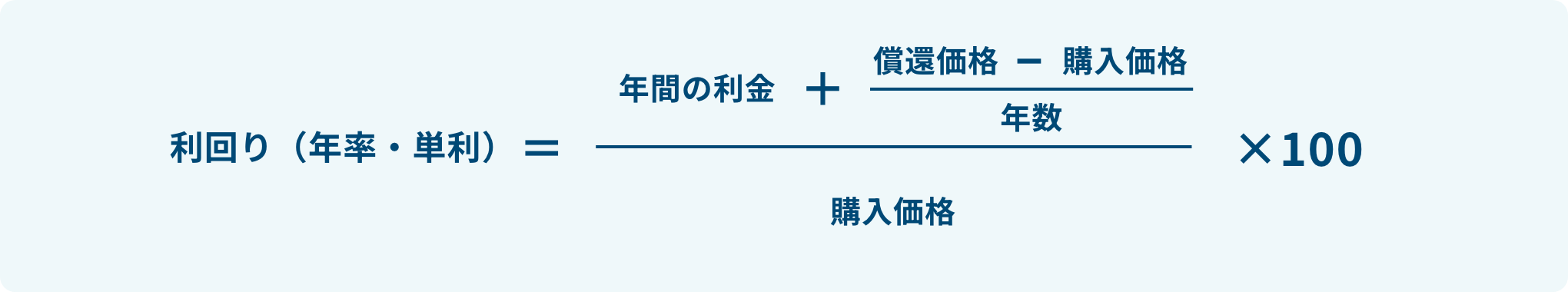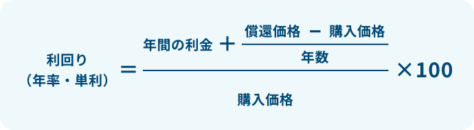 利回りは、債券の購入価格とクーポンレート(表面利率)によって決まります。同じ債券でも額面(100円)より高く購入すると、100円で償還されるため利回りは低くなり、額面(100円)より安く購入すると利回りは高くなります。