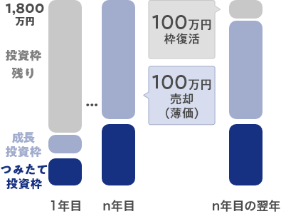 2024年以降のNISA枠では生涯投資枠(1,800万円)、年間投資枠(360万円)の範囲内であれば、売却した投資枠を再利用することができます。買付時の取得価額に応じて生涯投資枠が復活し、売却した翌年から年間投資枠の範囲内で利用することができます。